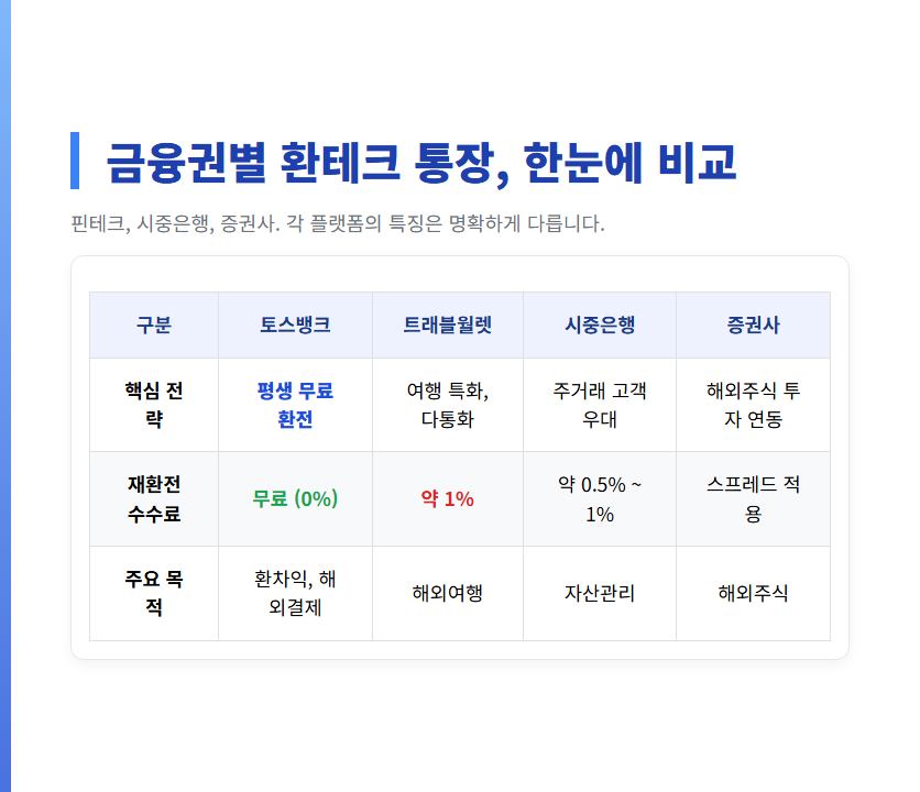 | 주요 사용 목적 | 외환 투자 (환테크) | 다통화 여행 결제 | 하이브리드 (여행/저축) |