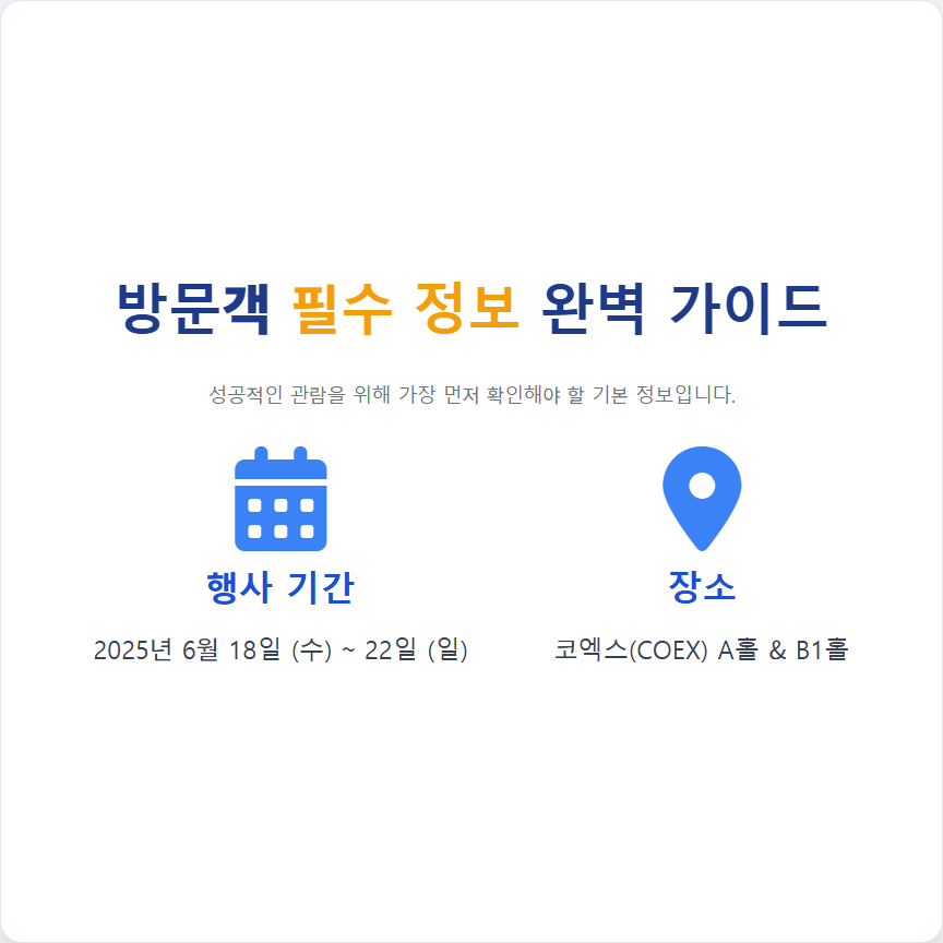 - 장소 및 교통: 코엑스 A홀 & B1홀 (서울 강남구 영동대로 513). 지하철 2호선 삼성역 또는 9호선 봉은사역과 연결되어 있어 대중교통 이용이 매우 편리합니다.